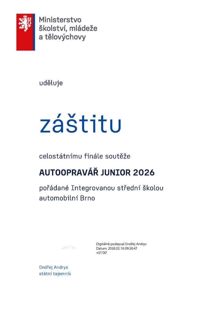 S potěšením oznamujeme, že Ministerstvo školství, mládeže a tělovýchovy udělilo záštitu celostátnímu finále soutěže Autoopravář Junior 2026. Tato podpora představuje významné ocenění dlouhodobé práce všech organizátorů, kteří se podílejí na přípravách soutěže.